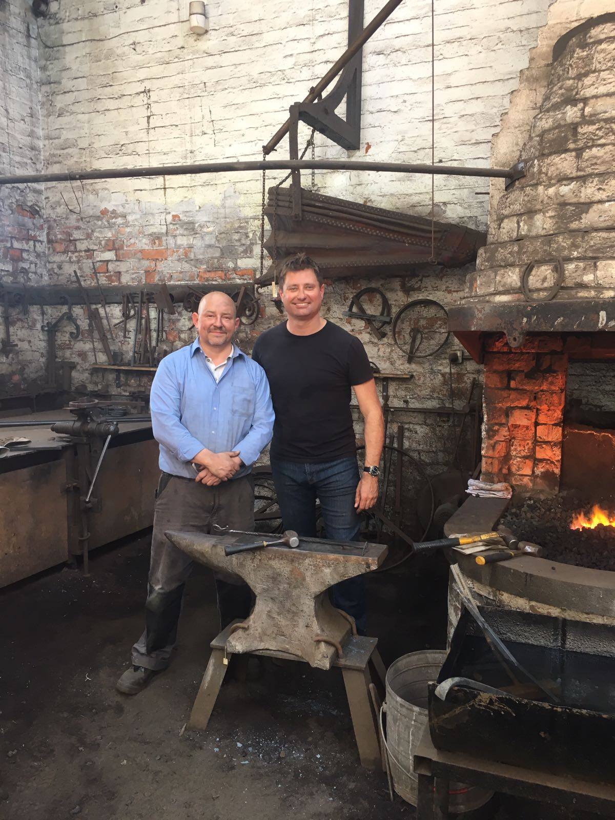 Take a look at Alex Price as he works in his forge alongside his assistants on an Art Deco gate Alex Price designed, made and fitted at a property in Liverpool. George Clarke of popular Tv show Old House new Home and his crew visit the forge to film, chat about the commission and George tries his hand at blacksmithing making a scroll for the Art Deco gate.